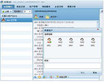 当客户咨询时,处于当前会话中的员工如果无法解决或者觉得由另一位员工更能为该客户服务,则可随时使用“客户转接”功能,可以很方便的由一个工号转到的另一个工号为此客户服务。